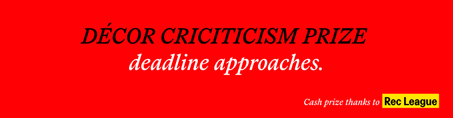 News about the Wallpaper*-featured FOR SCALE PRIZE FOR VERY GOOD DÉCOR CRITICISM – (a) introducing our sponsor (dreamy pals at REC LEAGUE) and (b) a key reminder that deadline is, like, in a week. Feb 15 @ 23:59 PST. SUBMIT. $1,500 of American dollar prize money.