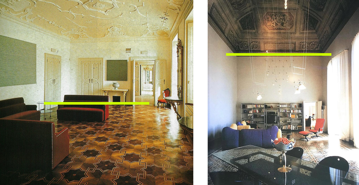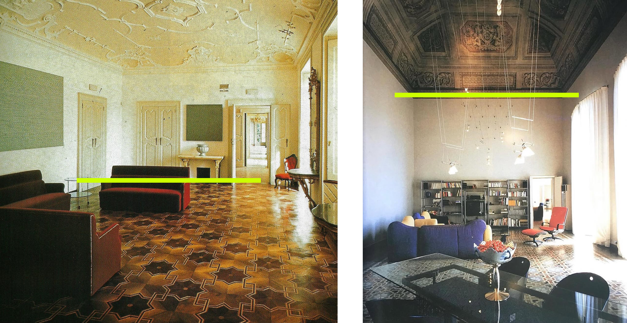 On the left, the drawing room at the Villa Menafoglio which we found again via M_R.A.A.D,very subtle, and our little chartreuse line doesn’t really cut it — but mod art, little chrome table, but ornate as f*ck historic ceiling. You can see it’s like “OH OKAY, it’s not 100% A THING.”