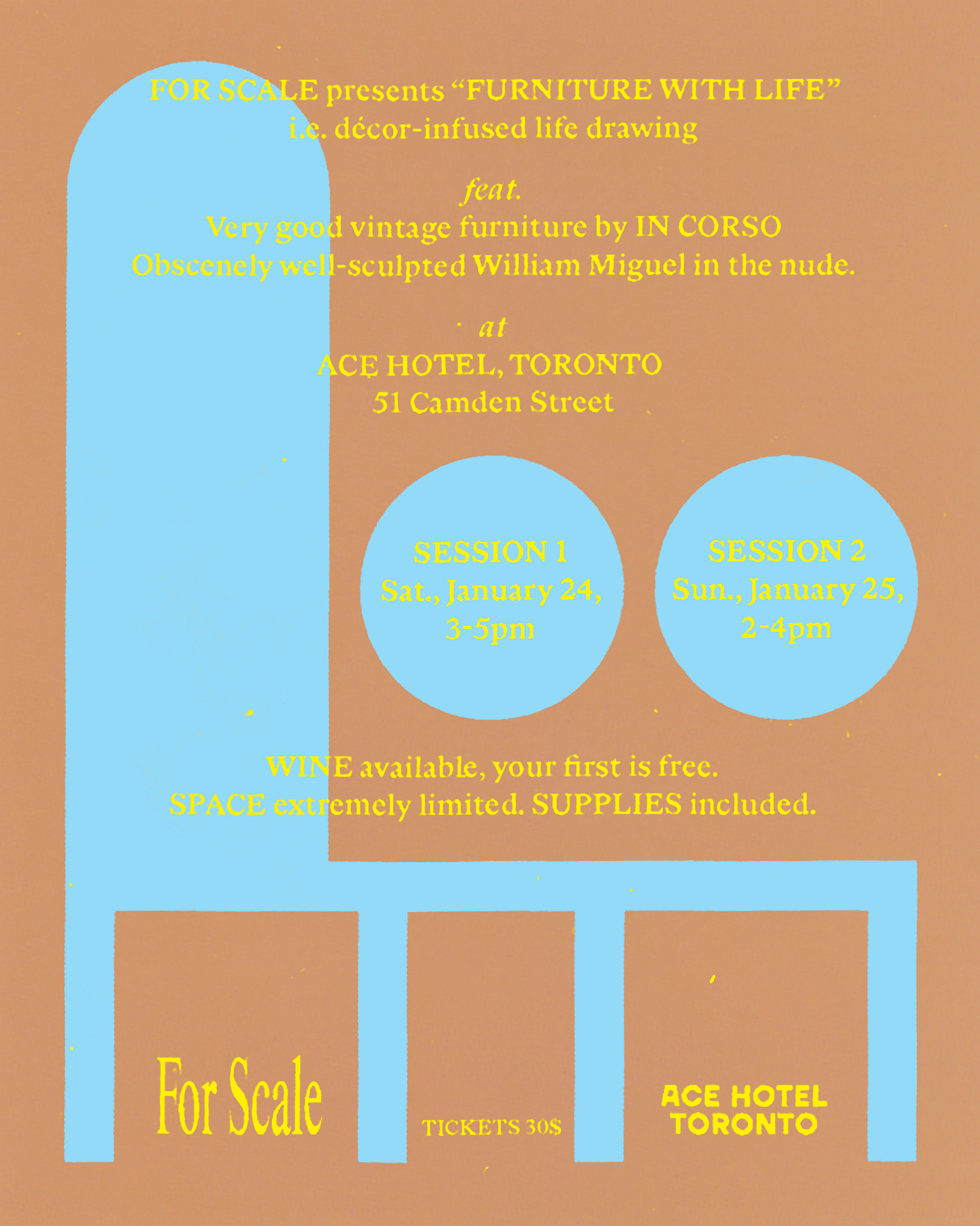 NEWS 2 - TORONTO. We’re hosting a LIFE DRAWING thingy with a very a handsome man atop handsomer furniture care of IN CORSO, and guided by a very skilled art-director-turned-painter Rhys Ker. At the Ace Hotel (we love them! so kind to us!). Tickets: Jan 24 and Jan 25.