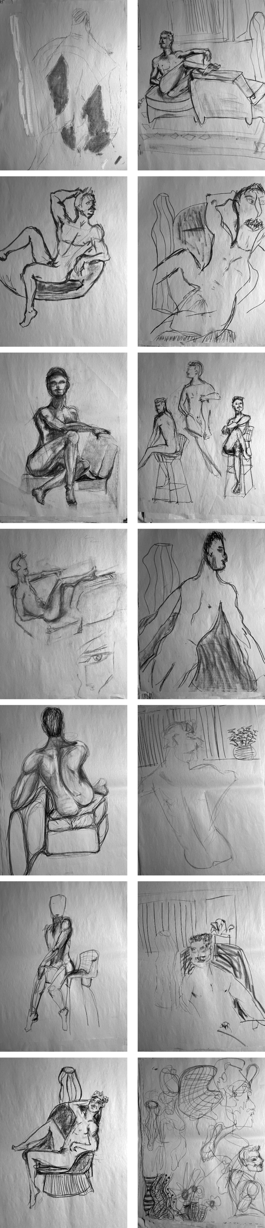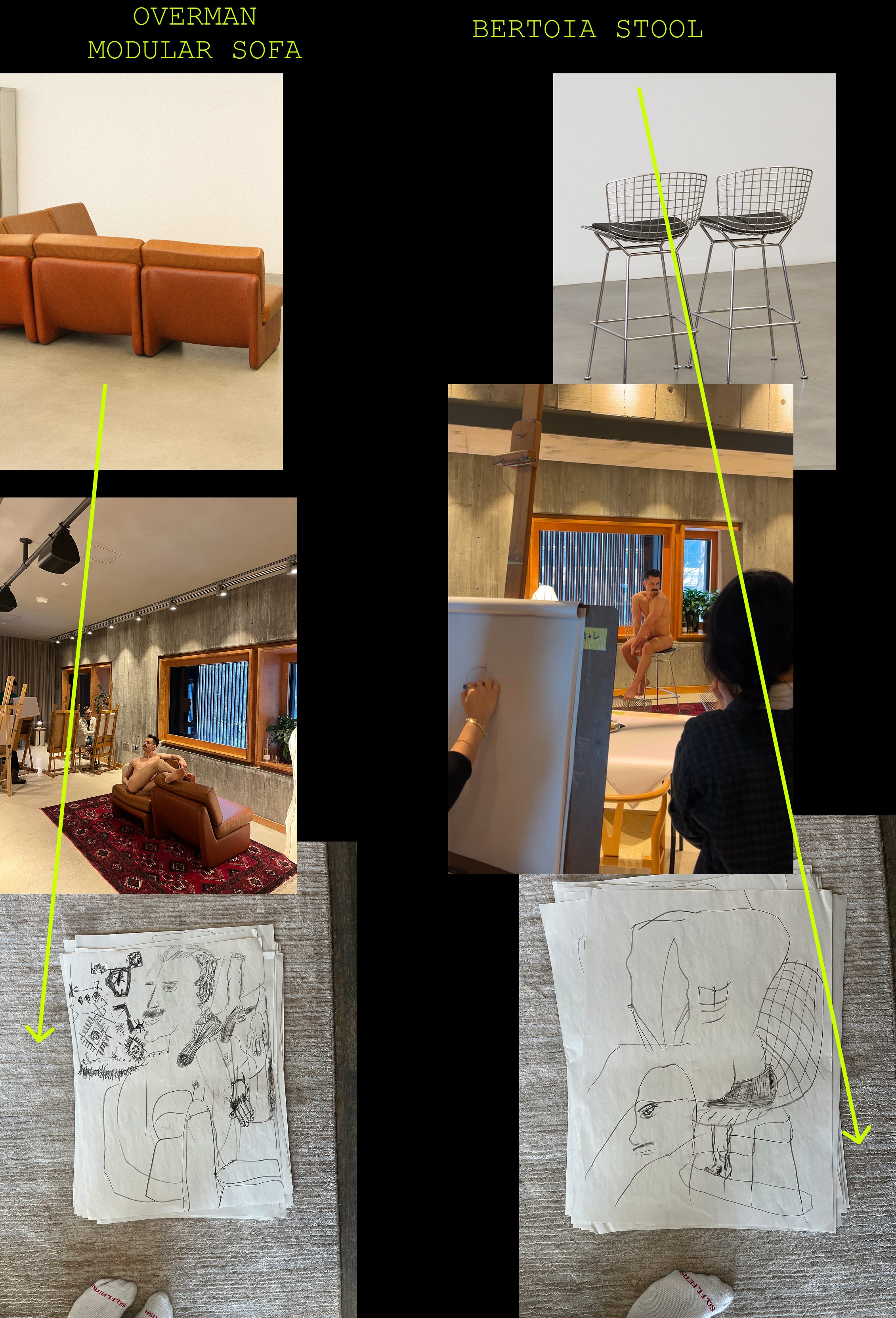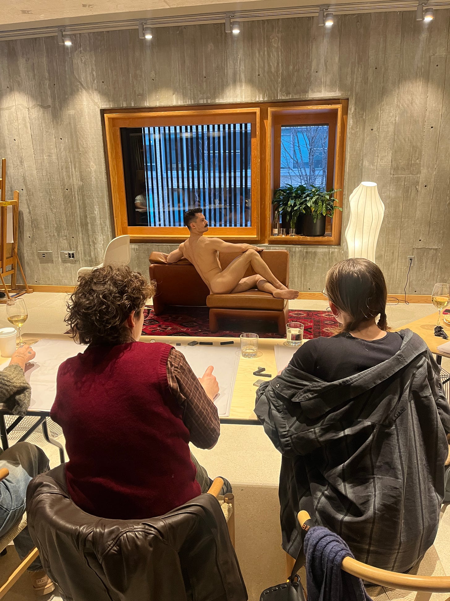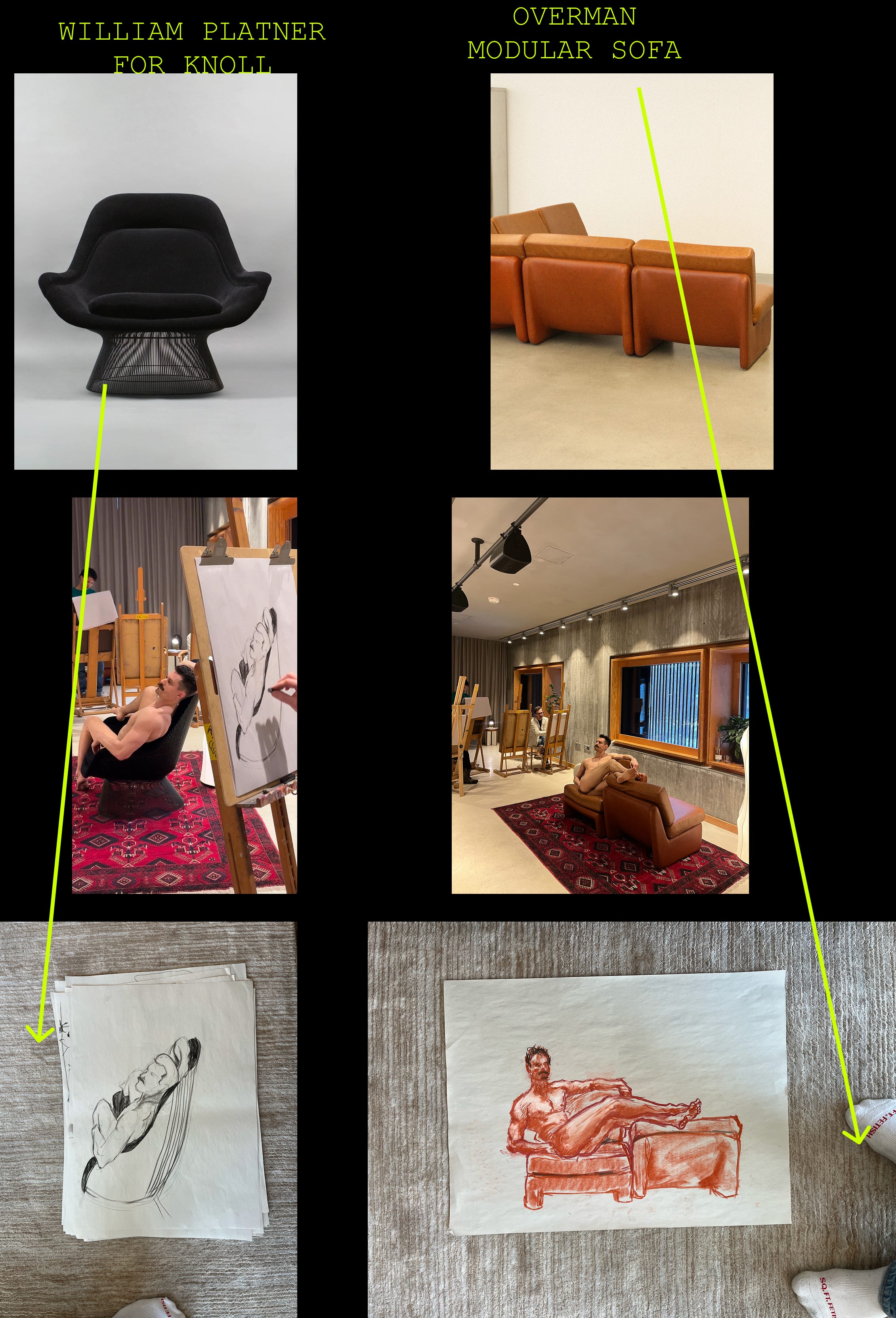 (1) it was a life drawing class with a very handsome nude model (WILLIAM MIGUEL) posing atop Very Excellent Vintage Furniture (Bertoia, Panton, Platner, etc., all provided by décor-source-to-know IN CORSO).